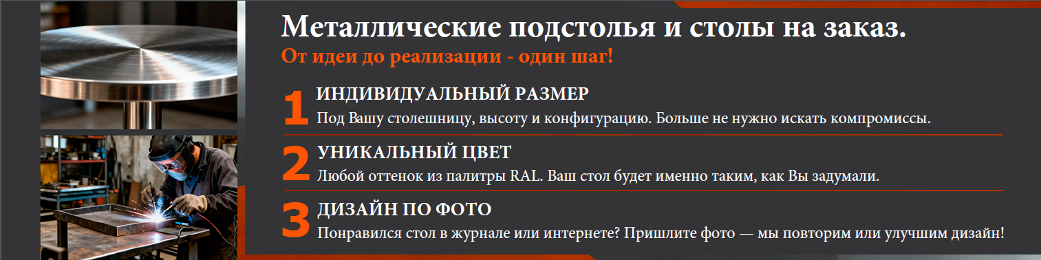 Наша компания производит подстолья для столов уже несколько лет, мы производим: хромированные подстолья, подстолья из нержавеющей стали, кованые подстолья, чугунные подстолья и подстолья для столов с порошковой окраской. Подстолья пользуются большим спросом у конечного потребителя - это кафе, бары, рестораны, аэропорты и вокзалы, а также компании, занимающиеся комплексным оснащением, и торговые организации.